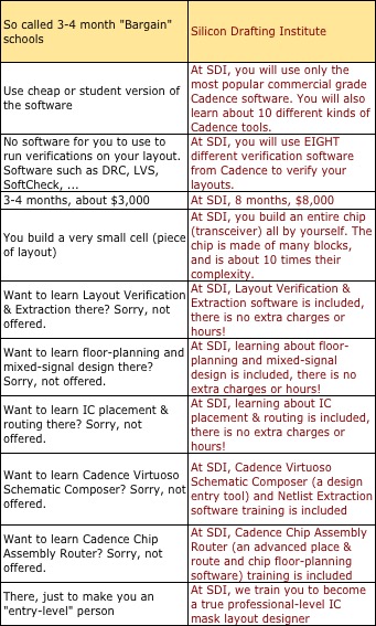 Silicon Drafting Institute focuses heavily on layout techniques, skills and theories. We also train students how to handle job interviews. Our class materials and hand-outs are written by professionals - senior engineers and layout managers - and are tailored to meet the needs of all semiconductor firms. Also, these materials are constantly kept updated to keep pace with the changing technologies. On the contrary, some schools come up with their handouts by directly copying materials off engineering text books. Because of this, either most of the information on those handouts are irrelevant to layout, or it is too technical for an average person to comprehend and digest.